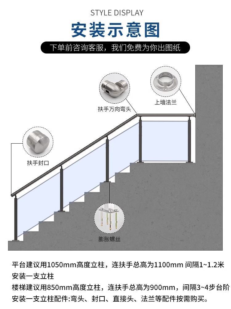 栏杆高度(一般在 900mm-1200mm之间,具体规格可按用途设定)