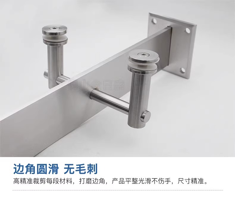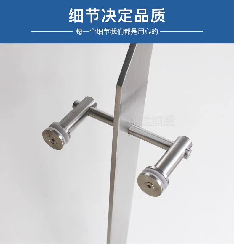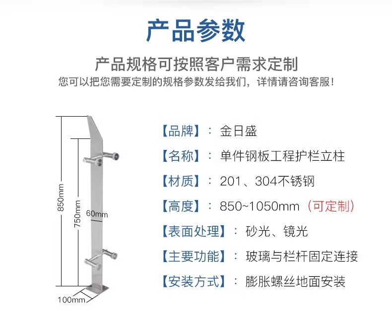此产品为工程护栏立柱,多次被市政府,高铁站,飞机场,超商,大型企业采购。强度高,耐磨损,耐腐蚀,色泽好。加厚价款底座更加结实耐用,圆棒玻璃夹安装方便