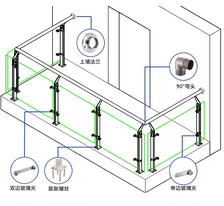 栏杆高度(一般在 900mm-1200mm之间,具体规格可按用途设定)